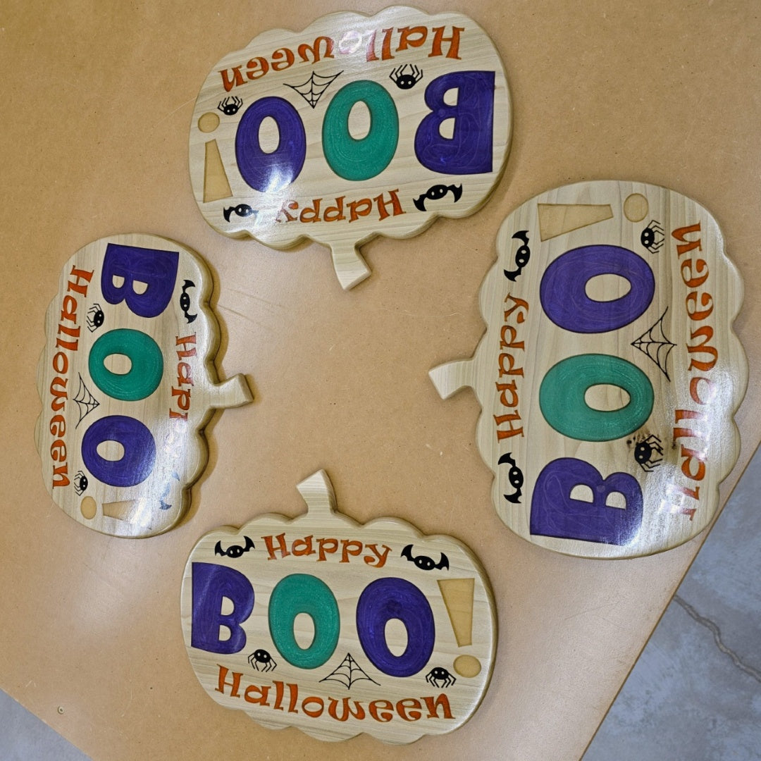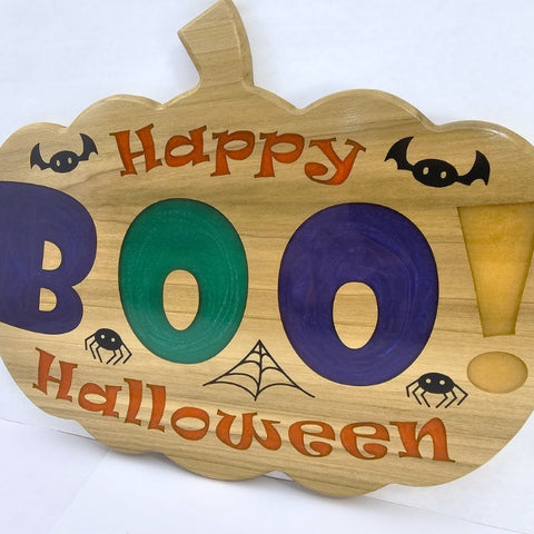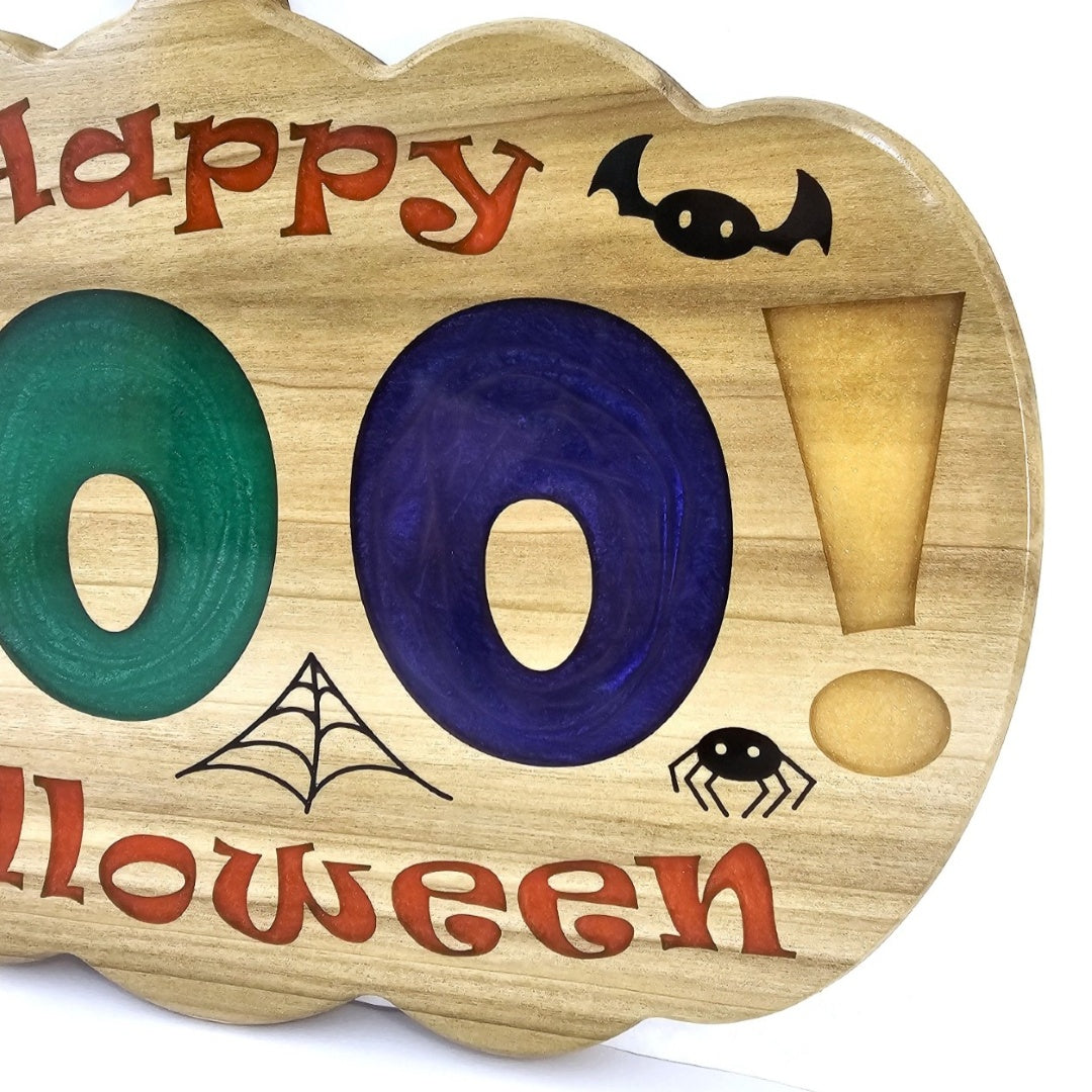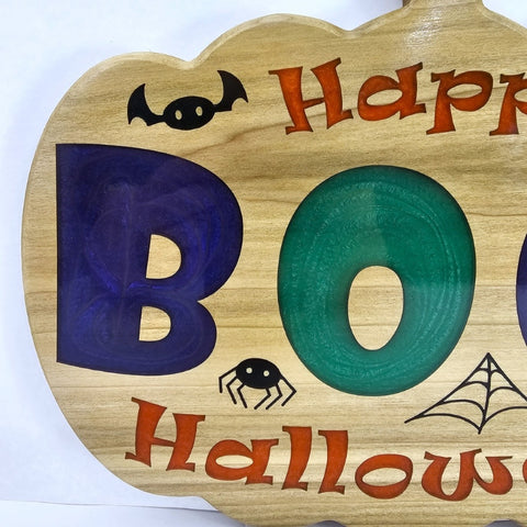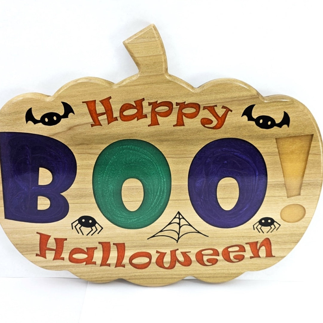 Bring the spooky spirit of Halloween to your home with this charming wooden sign! Shaped like a classic pumpkin, this vibrant decoration combines playful colors and delightful details to get your space Halloween-ready. The letters in "BOO!" are filled with sparkling purple, green, and gold epoxy while "Happy Halloween" is filled with orange. The cute bat, spider, and web accents are filled with black epoxy and capture the whimsy of the season. Perfect for door hangings, entryways, or mantel displays, this sign is a must-have for creating a welcoming, festive atmosphere. Crafted from poplar and epoxy and finished with a glossy polyurethane to bring out the vibrance of the colored epoxy. This piece makes a timeless addition to your Halloween décor. This sign is the perfect blend of spooky and cute and makes a great gift for anyone who loves Halloween. Add this charming pumpkin sign to your holiday collection today, and give your home a festive touch that will delight guests of all ages.